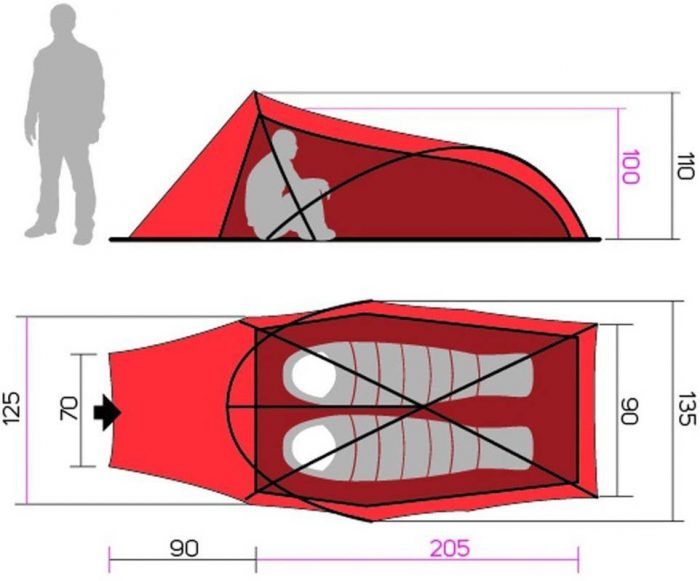 - Размер внутренней палатки: 2050 х 900 х 1000 мм (ДхШхВ)
